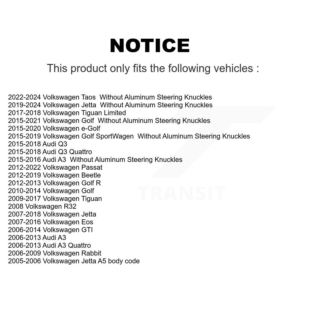 | 2018 | Volkswagen | Golf SportWagen | Without Aluminum Steering Knuckles | Front Left Lower |
